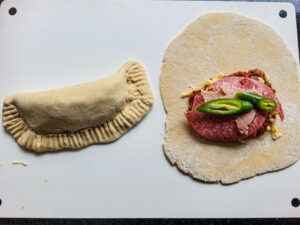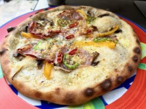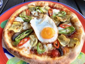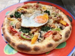 Een pittige Pizza met Gehakt, Ham en Salami aangevuld met wat groenten en Oregano. Als extra een gebakken Ei.