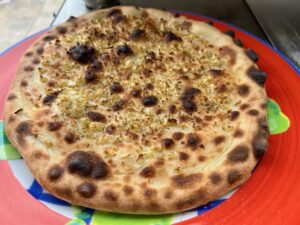 Een lekkere blanke Pizza met Creme Fraiche. Ik laat altijd de zaadjes in de Rode Peper zitten zodat deze wat extra pittig is.