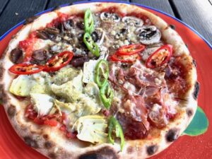 Een Pizza met 4 verschillende soorten beleg, Champignons, Boeren Beenham, Olijven en Artisjok hart. Altijd te weinig…